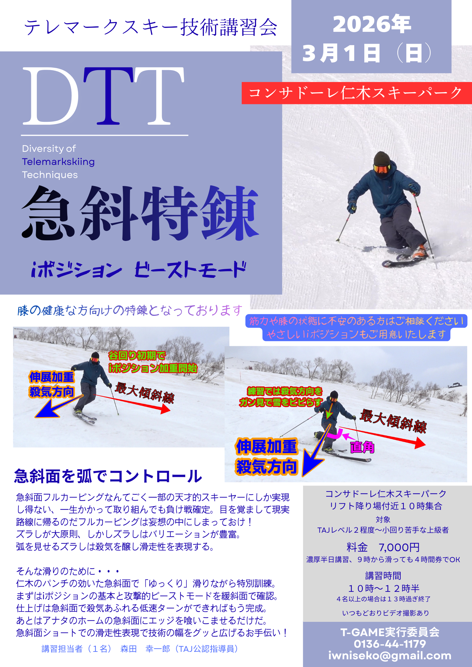 TAJ公認指導員や様々な滑り手との交流や講習会通じて多様なテレマークスキー技術について検証するプロジェクトです。