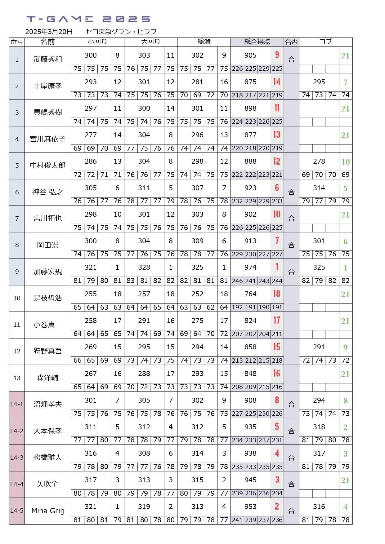 T-GAME2025では総合順位は小回り、大回り、総合滑降の3種目の合計得点で決定します。4審4採ですので1種目あたり400点、総合順位満点は1200点となります。
